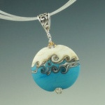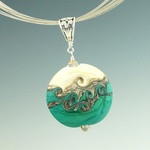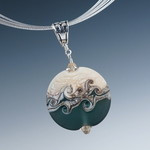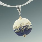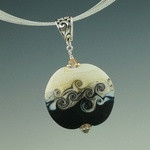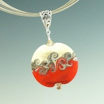Two rich colors partner with bands of silver and ivory in this Swirled Orb pendant. With its distinctive matte surface, it looks more like stone than glass. Once the bead is shaped, the surface of one side is heated, and while hot, the glass is swirled with a thin rod of glass to create a unique design. The other side is left natural. Wear either side for a completely different look.